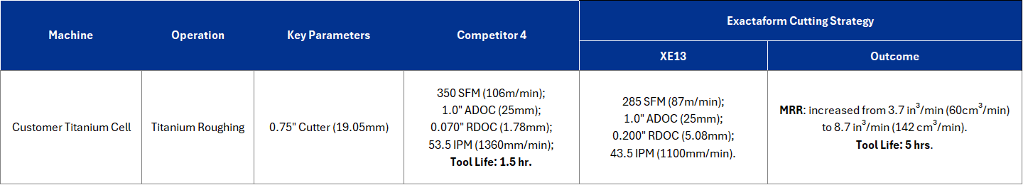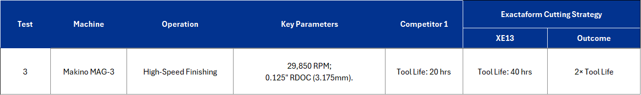 On this trial, the customer’s existing tool, a 0.75" six-flute cutter with a 0.120" radius, was run at 350 SFM with an axial depth of cut of 1.0", a radial engagement of 0.070", and a feed rate of 53.5 IPM. Under these conditions, the process achieved a metal removal rate (MRR) of 3.7 in³/min and yielded approximately 1.5 hours of tool life. After reviewing the application, Exactaform recommended an adjusted strategy using XE22, maintaining the same axial engagement but reducing SFM to 285, increasing chip load to 0.005 per tooth, and increasing the radial engagement to 0.200". This made the feed rate 43.5 IPM, which produced an MRR of 8.7 in³/min, while extending tool life to 5 hours.