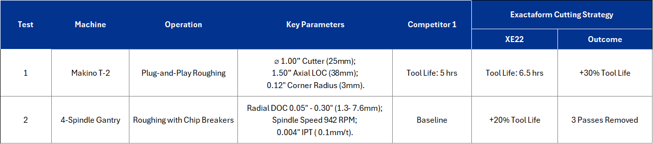 Across multiple controlled trials against Competitor 1, Exactaform XE22 and XE13 demonstrated consistent advantages in tool life, radial engagement capability, and overall process reliability. All tests were performed under real production conditions, using matched parameters wherever possible to ensure comparability between tools and platforms.