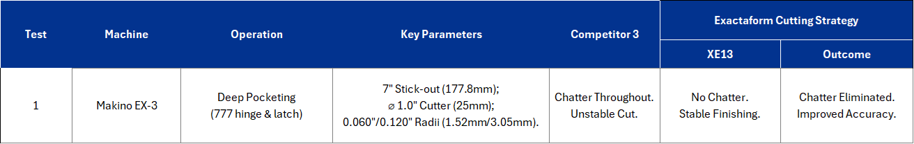 On a Makino EX-3 producing hinge and latch deep pockets for the Boeing 777, Competitor 3’s tool, a 1.0" three-flute cutter with ZRN coating and corner radius of 0.060" and 0.120", exhibited persistent chatter due to the extended 7" stick-out required for the part. This instability affected both surface integrity and dimensional accuracy. Replacing the tool with an Exactaform XE13 two-flute finisher, designed with an alternative flute geometry and supplied uncoated for optimal edge retention, immediately eliminated chatter and stabilized the process.