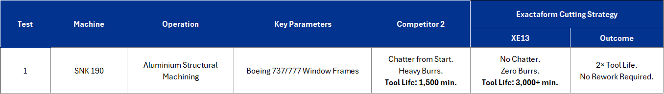 On SNK’s machining of Boeing 737 and 777 window frames, Competitor 2’s tool performance deteriorated rapidly. The cutters exhibited chatter from the start of the process, created significant burr formation, and reached end-of-life at approximately 1,500 minutes, resulting in additional time spent deburring and reworking. Replacing the tool with an Exactaform XE13 three-flute design with enhanced flute geometry, improved corner-radius protection, and the DLC coating produced a clear operational difference.